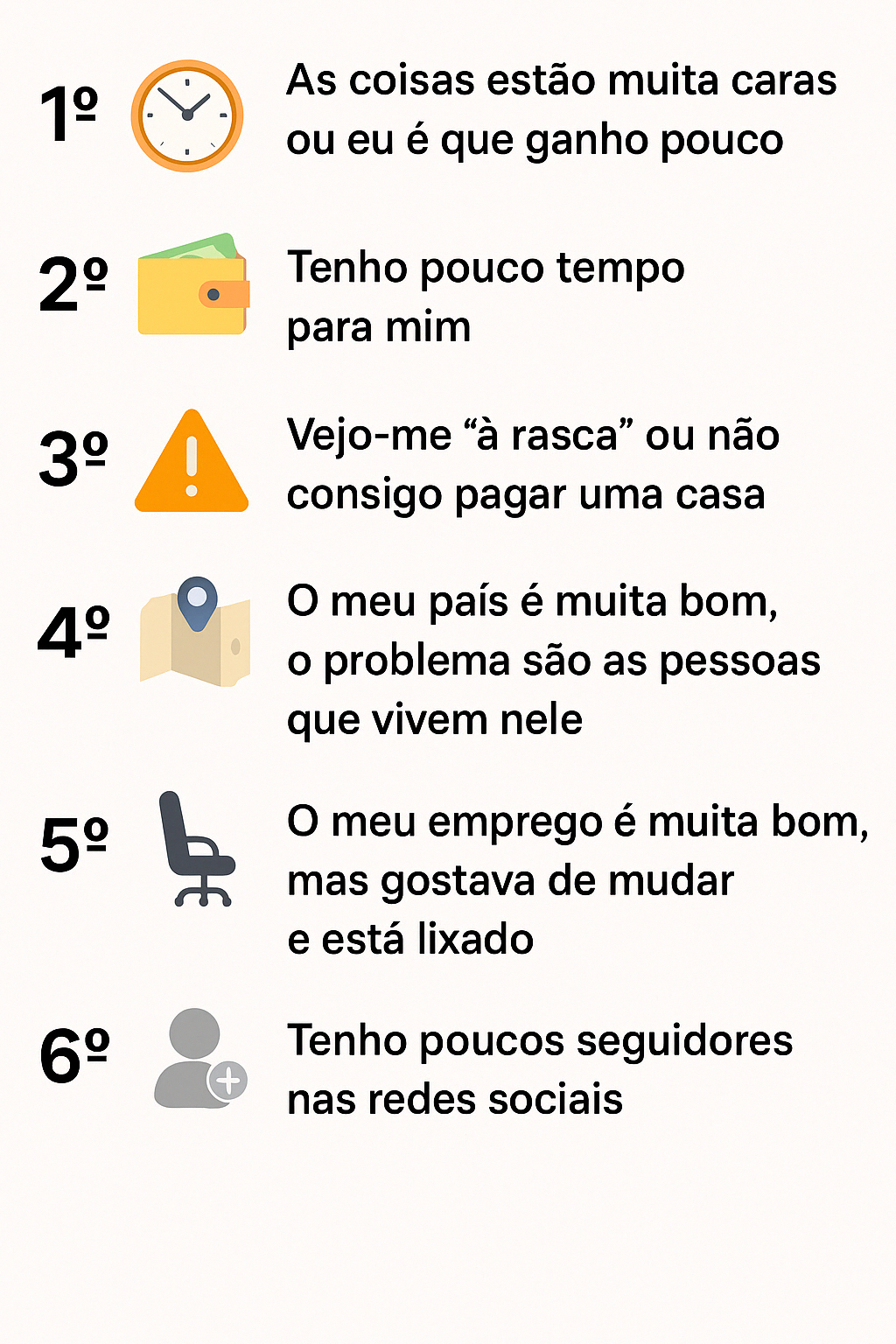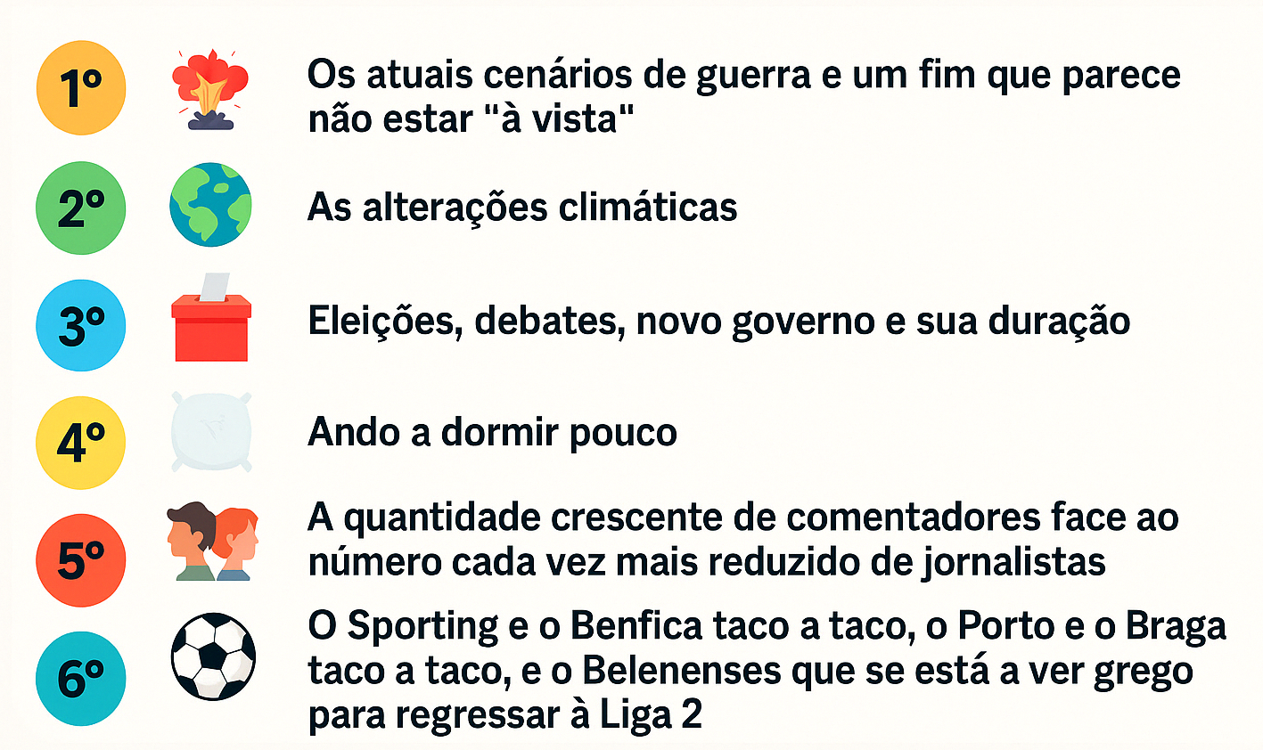 75% dos inquiridos diz que estes temas lhes mexe com os nervos e, também 75%, refere que existem outros temas que lhes "lixa o miolo", os quais ordenam da seguinte forma.
